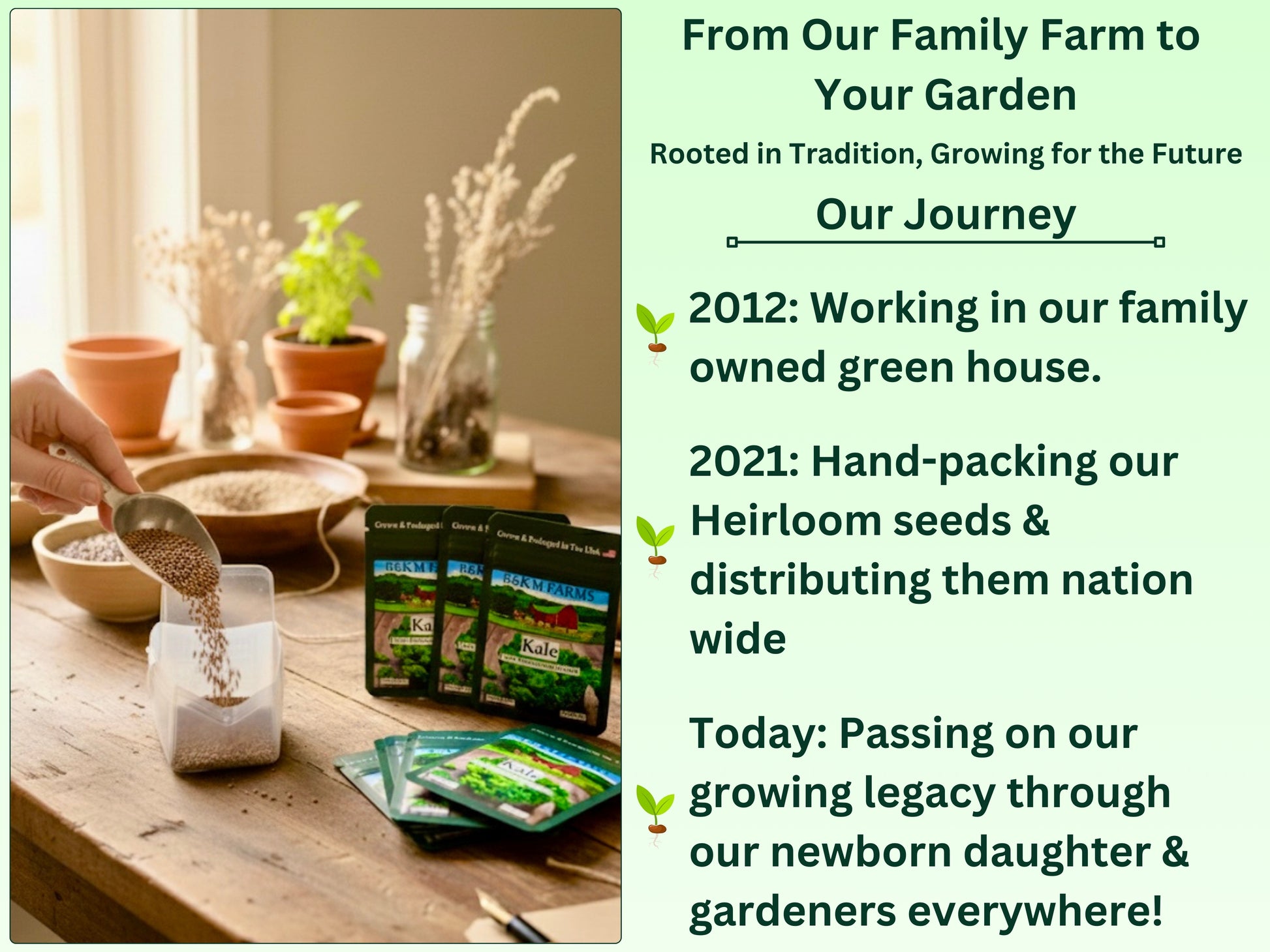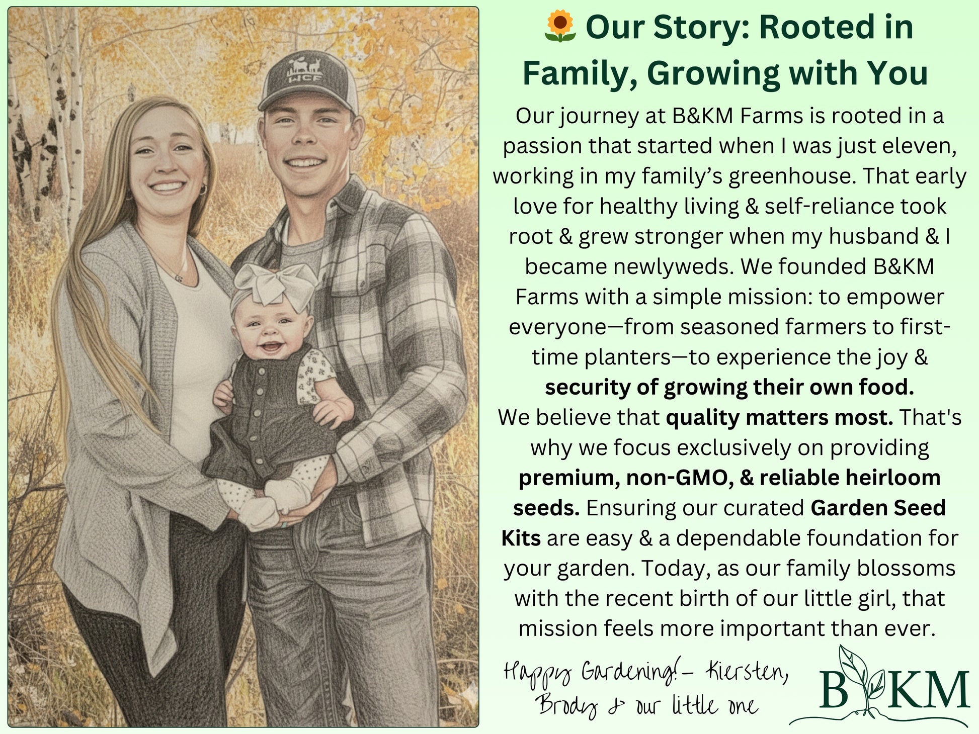 Every single packet is Hand-Packaged right here at B&KM Farms. We take pride in ensuring the highest germination rates and providing generous seed counts, so your rows are full, lush, and productive.
